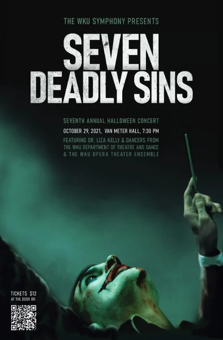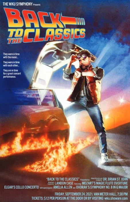 Brian: The source image was the motivation for the season-long theme of famous movie posters as source material. When I first saw that original image, I immediately thought of "Back to the Classics" since it was going to be our first concert back together after a summer break and a season of platooning the orchestra due to campus-wide COVID-19 regulations. Putting Dvorak's face in place of Michael J. Fox's made the whole poster work. The three bullet-point-style phrases on the left side of the poster poke gentle fun at the Symphony's practice habits.